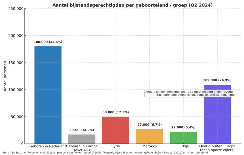 In het 2e kwartaal van 2024 hadden mensen geboren in Nederland ongeveer 180.000 bijstandsuitkeringen (≈ 44% van het totaal).Centraal Bureau voor de Statistiek